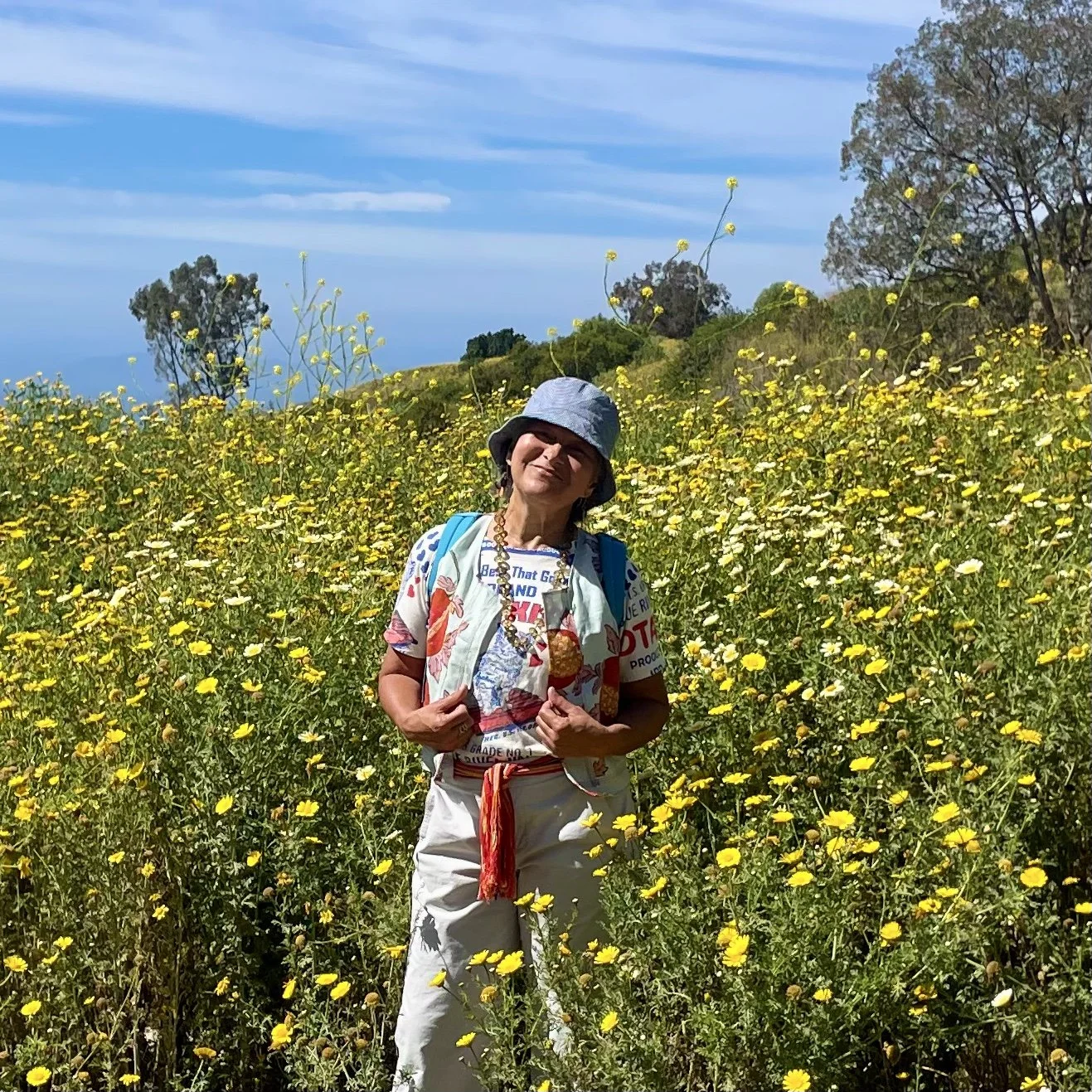 RoseMary Goldenfield is a multicultural alchemist artist based in the seaside town of Santa Barbara, California. With a creative process that mixes photography, printmaking, collage, painting and stitching with words of wisdom, she magically transforms life’s sour lemons into the sweet lemonade of vibrant enthusiasm and endless possibility. Inspired by her Hungarian folk art heritage and the luscious foliage of her native French Caribbean island, her work is a global fusion that radiates aliveness, resilience and her innovative spirit. Known for her open-minded and dynamic approach to both art and life, RoseMary chooses her daily outfits (which she often designs and sews) much like she begins a painting—by intuitively layering colors that spark joy and curiosity.